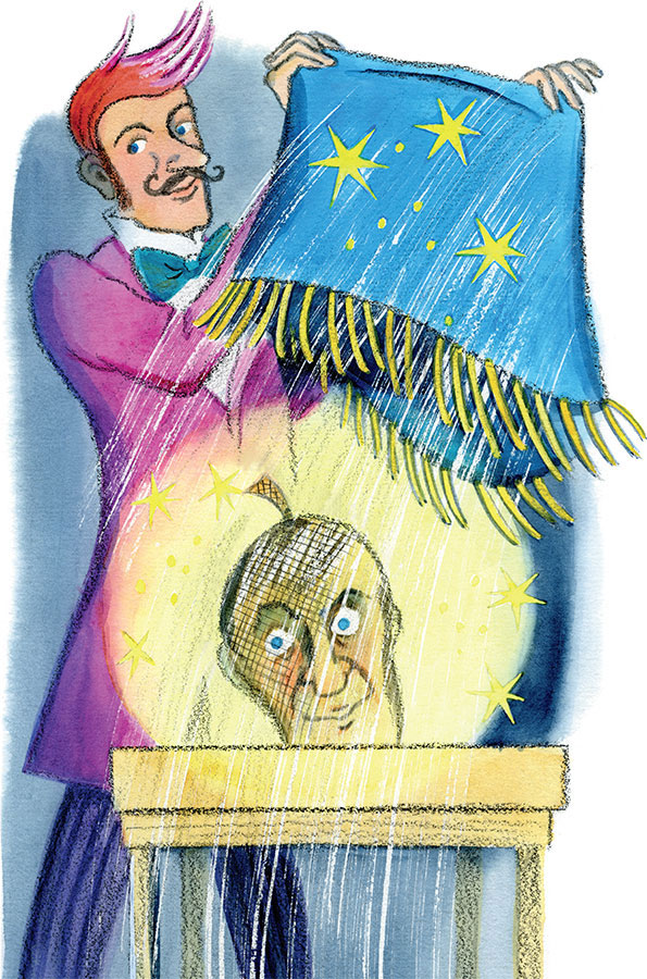 – Н-нужная вещь! – восклицал фокусник, чуточку заикаясь: – Д-дорогая!.. Но всё, что нам д-дорого!.. – он пританцовывал, поддёргивал рукава смокинга, дул на свой свёрток. – Можно – хоп! – он разорвал бумагу, – и п-потерять!..