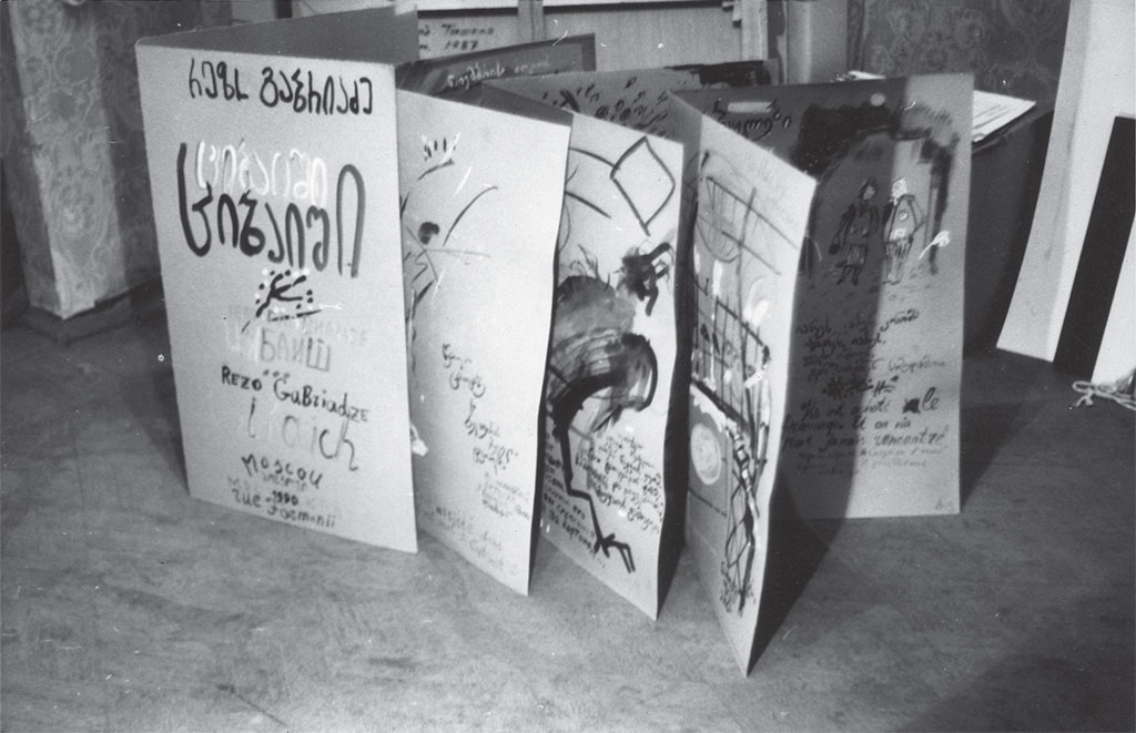Будучи в Москве, Резо Габриадзе часто наведывался в мастерскую Леонида Тишкова в Фурманном переулке. Огромные комнаты опустевше го старинного дома были наполнены до самой крыши творчеством – в нем нашли себе приют десятки художников, без спроса въехавшие туда со своими кисточками и холстами. Леонид увлекался созданием книг, и Резо на нескольких листах картона за вечер сочинил-нарисовал книгу под названием «Цибайш», посвятив ее китайскому художнику Ци Байши. Где обитает эта книга, теперь никто сказать не может, но осталась фотография, которую сделал Лёня Тишков фотоаппаратом «Практи ка», купленным в Германской Демократической Республике на гонорар за свои карикатуры в журнале «Freie Welt». Все исчезает со временем, но иногда фотографии делают нашу память зримой.