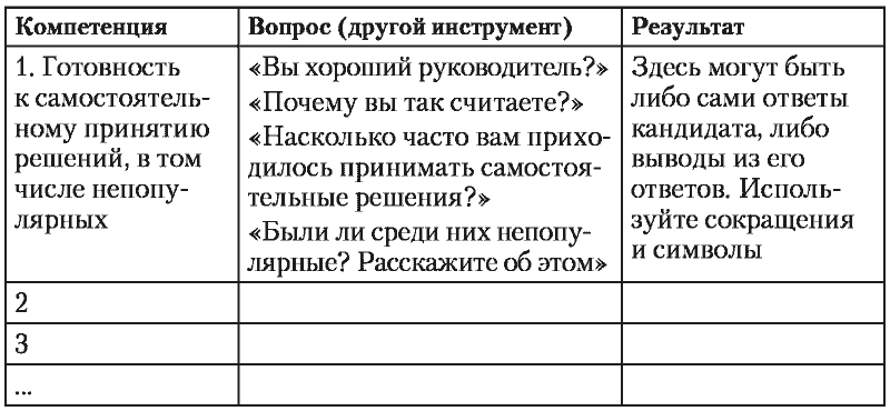 В приложении 3 вы познакомитесь с готовым заполненным бланком интервью. Бланк удобен тем, что структурирует процесс интервью, не отвлекает внимание интервьюера на составление нужных вопросов. Кроме того, он позволяет четко придерживаться определенного плана. Благодаря ему вы не уходите в лишние обсуждения, не имеющие отношения к нужным компетенциям. Конечно, иногда спонтанно родившийся вопрос может дать ценную информацию о кандидате. Такое возможно, но это не исключает наличие плана интервью, тем более если время ограничено и расписан график прихода кандидатов. Бланк позволяет точно определить, есть у нас все инструменты для оценки нужных компетенций или следует добавить еще вопросов. Не обязательно задавать все вопросы из бланка, возможно, достаточно будет лишь некоторых. Когда вы поймете, что графа «Результат» заполнена – можно завершать интервью. Некоторые компетенции не требуют вопросов, они легко видны из наблюдения за поведением кандидата. Например, уверенность в поведении. Тем не менее эту компетенцию тоже стоит внести в бланк, чтобы помнить о том, на что обратить внимание. В графе «Результат» может быть просто «+» или «-». Или это могут быть конкретные комментарии. Например: «Уверенно зашел в кабинет, открытые жесты, инициирует диалог», или «Уточнить реакцию на критику», или «Не смог привести пример из своего опыта…» и пр.