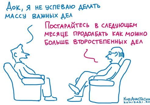 Сразу оговариваю: если этот горящий проект – вопрос жизни и смерти, он один такой на миллион, единственный шанс в жизни, то да, надо им заняться. Но большую часть задач точно можно отложить, скажем, часа на три, а то и на денек – никто не помрет. Так чем же на самом деле стоит заняться?