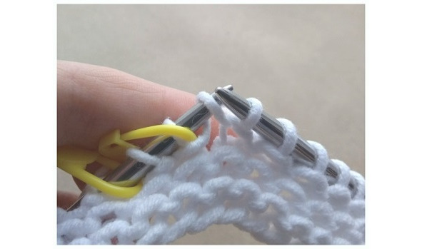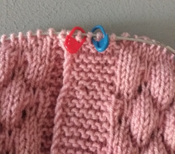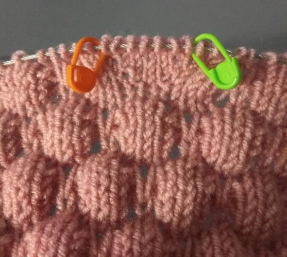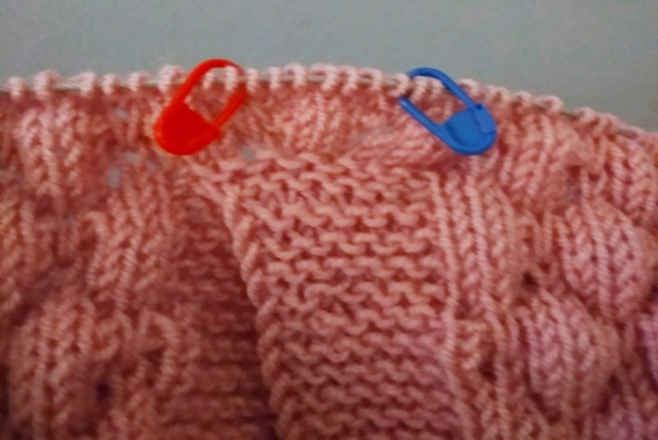 Далее будем вязать ластовицу, для этого по центру переда и спинки нужно повесить маркеры от начала планки: