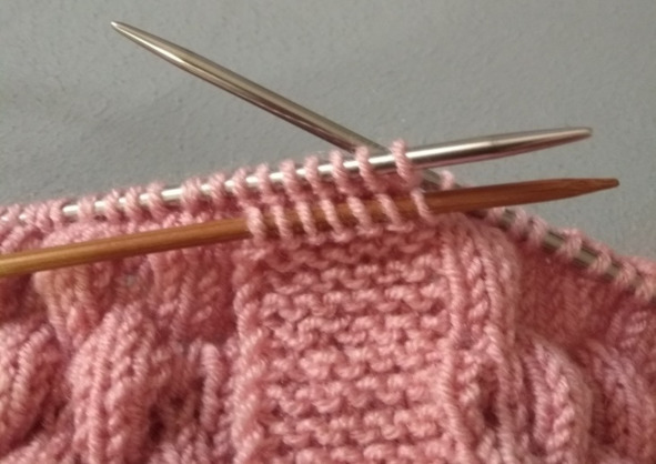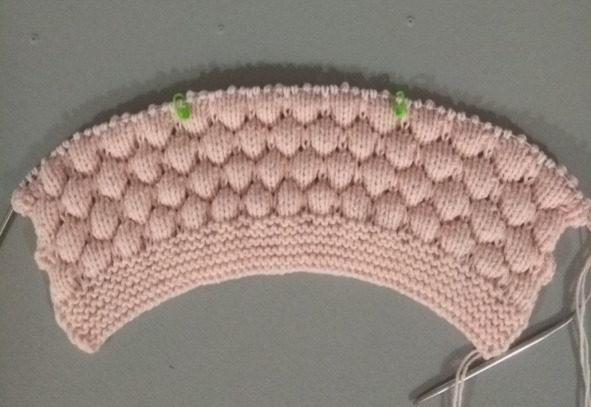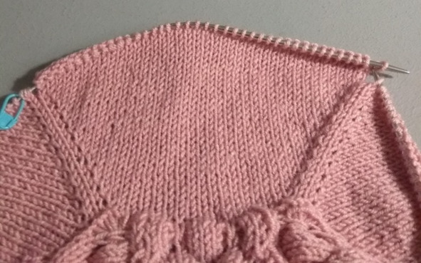 15 ряд: кромочная, 19 лицевых, прибавка из протяжки, 2 лицевых, прибавка из протяжки, 16 лицевых, прибавка, 2 лицевых, прибавка их протяжки, 29 лицевых, прибавка из протяжки, 2 лицевых, прибавка из протяжки, 16 лицевых, прибавка, 2 лицевых, прибавка их протяжки, 19 лицевых, 1 изнаночная