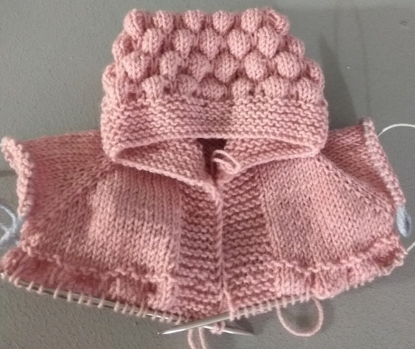 9 ряд: кромочная, 16 лицевых, прибавка из протяжки, 2 лицевых, прибавка из протяжки, 10 лицевых, прибавка, 2 лицевых, прибавка их протяжки, 23 лицевых, прибавка из протяжки, 2 лицевых, прибавка из протяжки, 10 лицевых, прибавка, 2 лицевых, прибавка их протяжки, 16 лицевых, 1 изнаночная