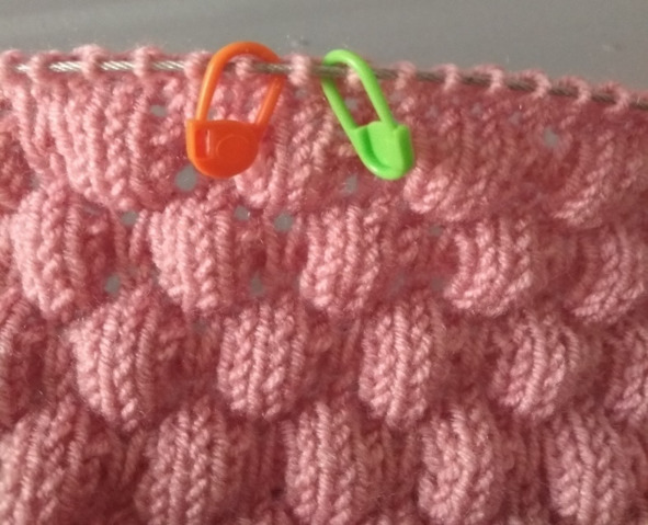 85 ряд: (после красного маркера) 40 лицевых, прибавка из протяжки, 3 лицевых, прибавка из протяжки, 40 лицевых, прибавка из протяжки, 3 лицевых, прибавка из протяжки