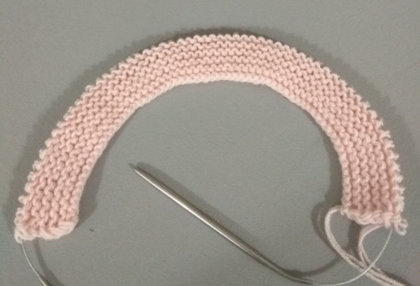 42 ряд: кромочная, 17 изнаночных, две вместе изнаночной. Разворачиваем вязание.