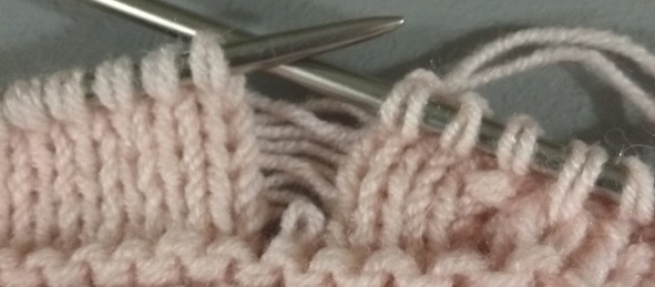 31 ряд: кромочная, 6 лицевых планки, (3 лицевых, распустить вниз 6 рядов и петлю нижнего ряда провязать лицевой) – повторить 18 раз, 3 лицевых, 6 лицевых планки, 1 изнаночная