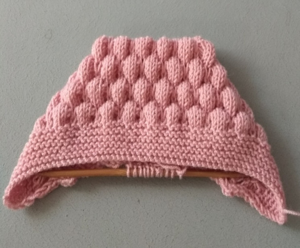 Далее нужно набрать по изнаночной стороне правой боковой части низа чепчика 21 петлю, провязать 11 петель средней части изнаночными, набрать по изнаночной стороне левой боковой части низа чепчика 21 петлю (всего 53 петли: 21+11+21=53)