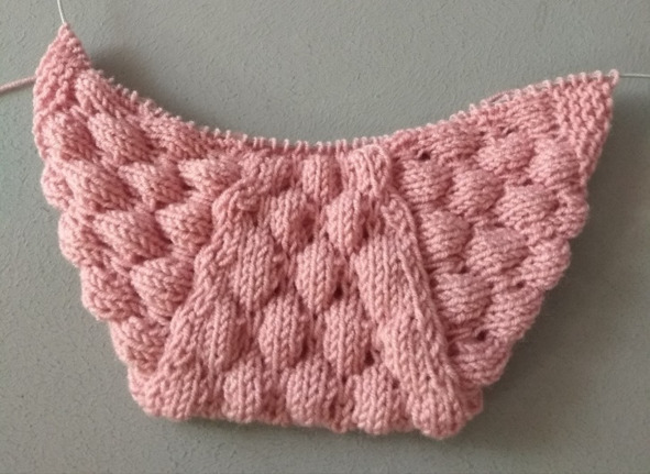 5 ряд: кромочная, 14 лицевых, прибавка из протяжки, 2 лицевых, прибавка из протяжки, 6 лицевых, прибавка, 2 лицевых, прибавка их протяжки, 19 лицевых, прибавка из протяжки, 2 лицевых, прибавка из протяжки, 6 лицевых, прибавка, 2 лицевых, прибавка их протяжки, 14 лицевых, 1 изнаночная