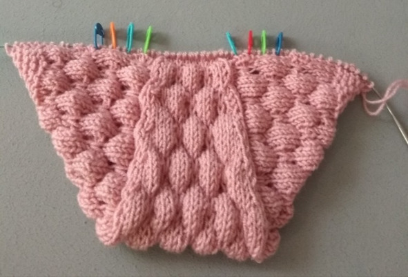 11 ряд: кромочная, 17 лицевых, прибавка из протяжки, 2 лицевых, прибавка из протяжки, 12 лицевых, прибавка, 2 лицевых, прибавка их протяжки, 25 лицевых, прибавка из протяжки, 2 лицевых, прибавка из протяжки, 12 лицевых, прибавка, 2 лицевых, прибавка их протяжки, 17 лицевых, 1 изнаночная