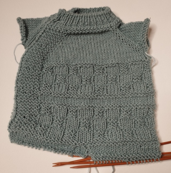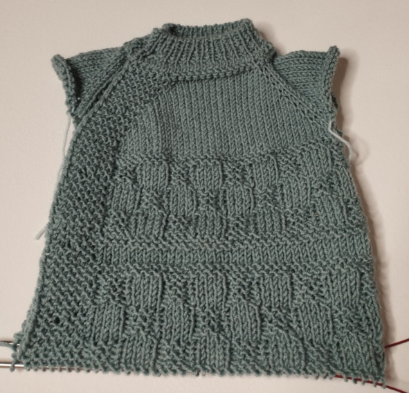 15 ряд: кромочная, 6 лицевых, прибавка из протяжки, 27 лицевых, прибавка из протяжки, 2 лицевых реглана, прибавка из протяжки, 16 лицевых, прибавка их протяжки, 2 лицевых реглана, прибавка из протяжки, 31 лицевая, прибавка из протяжки, 2 лицевых реглана, прибавка из протяжки, 16 лицевых, прибавка их протяжки, 2 лицевых реглана, 6 лицевых, 1 изнаночная