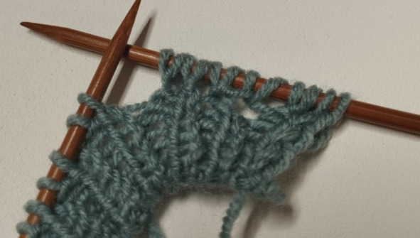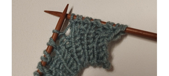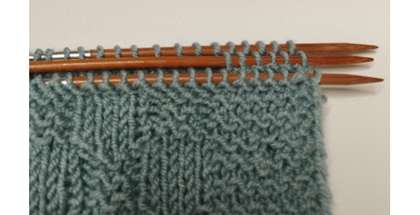 26, 28, 30 ряд: кромочная, 1 изнаночная, 1 лицевая, 4 изнаночных, 1 лицевая, 2 изнаночных, 1 лицевая, 4 изнаночных, 1 лицевая, 1 изнаночная, две вместе изнаночной (одна петля средней части, одна петля правой части). Разворачиваем вязание.
