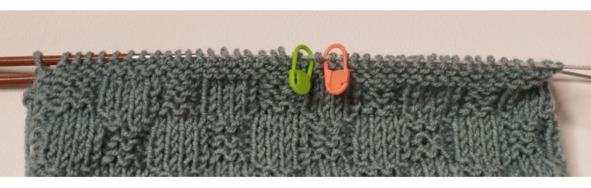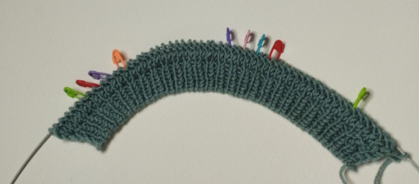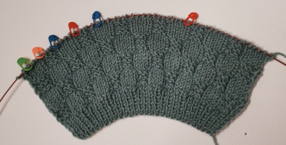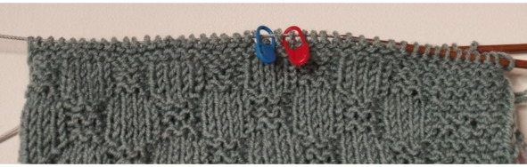 18 петель – маркер – 18 петель – маркер – 18 петель. Разделим наше вязание на три части. Петли до первого маркера – правая часть, петли до второго маркера – средняя часть, после второго маркера – левая часть.