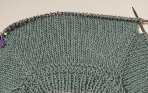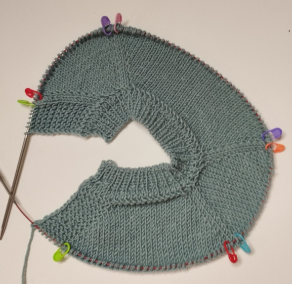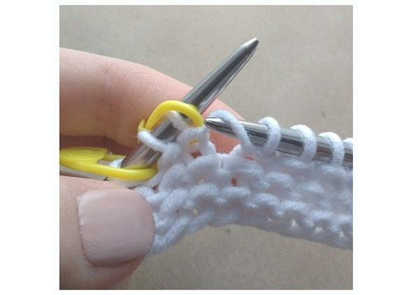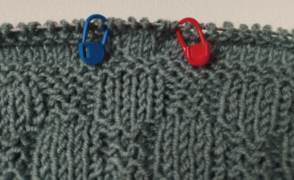 Затем будем вязать ластовицу. Для этого по центру переда и спинки нужно повесить маркеры (одна петля между маркерами).