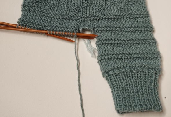 Переснимаем на спицы 41 петлю правой ножки. На контрастной нити остаются по 7 петель ластовицы спереди и сзади.