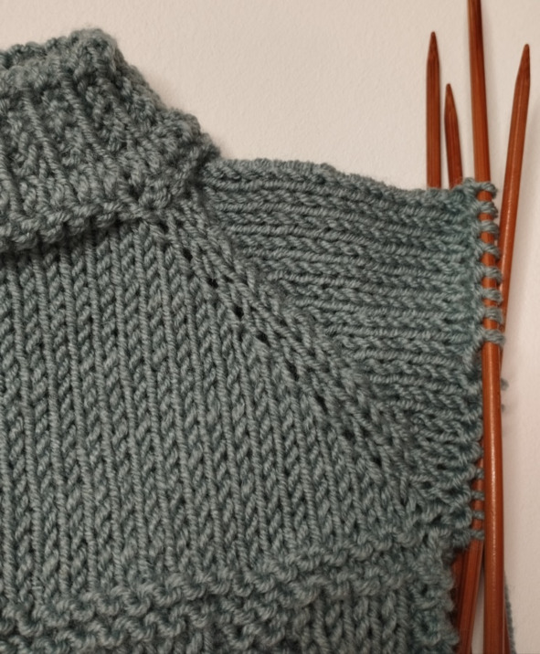 1 ряд: набираем 3 петли по краю переда, вяжем 24 лицевых рукава и набираем 5 петель по краю спинки (3+24+5= 32 петли)