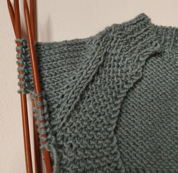 13 ряд: кромочная, 2 лицевых, накид, две вместе лицевой, 2 лицевых, прибавка из протяжки, 25 лицевых, прибавка из протяжки, 2 лицевых реглана, прибавка из протяжки, 14 лицевых, прибавка их протяжки, 2 лицевых реглана, прибавка из протяжки, 29 лицевых, прибавка из протяжки, 2 лицевых реглана, прибавка из протяжки, 14 лицевых, прибавка их протяжки, 2 лицевых реглана, 6 лицевых, 1 изнаночная