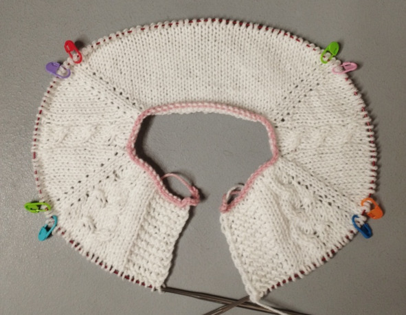 23 ряд: кромочная, 9 лицевых, 1 изнаночная, 4 лицевых, 1 изнаночная, 3 лицевых, 1 изнаночная, 3 лицевых, 1 изнаночная, 1 лицевая, переносим на контрастную нить 28 петель левого рукава (26 петель левого рукава +2 петли реглана), 43 лицевых, переносим на контрастную нить 28 петель правого рукава (26 петель правого рукава +2 петли реглана), 1 лицевая, 1 изнаночная, 3 лицевых, 1 изнаночная, 3 лицевых, 1 изнаночная, 4 лицевых, 1 изнаночная, 6 лицевых, накид, две вместе лицевой, 1 лицевая, 1 изнаночная (25+43+25 = 93)