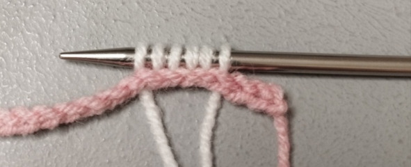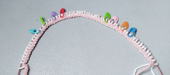 Затем из петель этой цепочки на круговые спицы №4 набираем 61 петлю пряжей белого цвета, затем вяжем 2 ряда лицевой гладью: