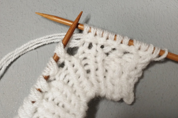57, 59 ряд: кромочная, 2 изнаночных, 4 лицевых, 2 изнаночных, две вместе лицевой (одна петля средней части, одна петля левой части). Разворачиваем вязание.