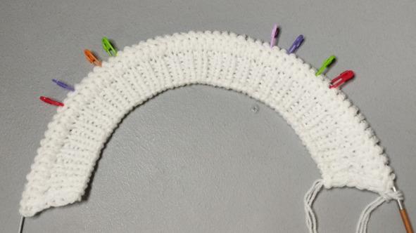 1 ряд: кромочная, 6 лицевых, 1 изнаночная, 3 лицевых, 1 изнаночная, 1 лицевая, прибавка из протяжки, 2 лицевых, прибавка из протяжки, 4 лицевых, прибавка из протяжки, 2 лицевых, прибавка из протяжки, 19 лицевых, прибавка из протяжки, 2 лицевых, прибавка из протяжки, 4 лицевых, прибавка из протяжки, 2 лицевых, прибавка из протяжки, 1 лицевая, 1 изнаночная, 3 лицевых, 1 изнаночная, 6 лицевых, 1 изнаночная