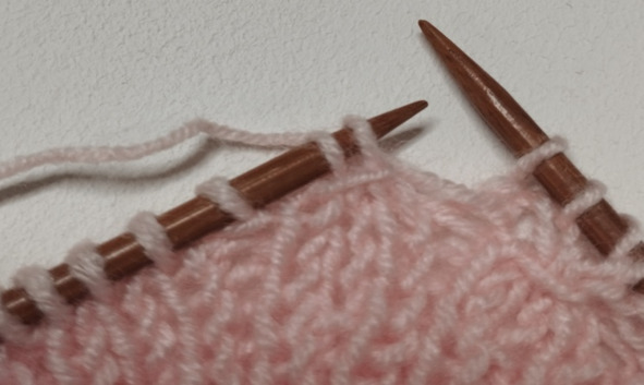 2—5 ряд: кромочная, (1 лицевая через переднюю стенку, 1 изнаночную снять, не провязывая, нить перед работой) – повторить 59 раз, 1 изнаночная