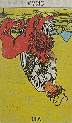 Я делала расклад для молодой женщины, ушедшей от мужа. Случилось так, что оставаться вместе было невозможно. Естественно, это тяжело, и по поводу расставания переживают многие. Тогда она еще сомневалась, правильно ли поступила. И тут же начали лезть со своими советами все, кому не лень, начиная от родственников и заканчивая коллегами, поэтому у нее и выпал аркан Сила перевернутый.