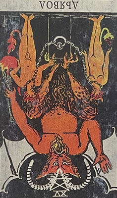 Это «бог» материального мира. Карта означает деньги. Власть, возможно, над кем-то конкретным. Зависимость. Крупный бизнес. Материально ответственный. Наркотики. Игромания. Алкоголизм, хотя не только этот аркан показывает такую зависимость, но и Луна в прямом положении.