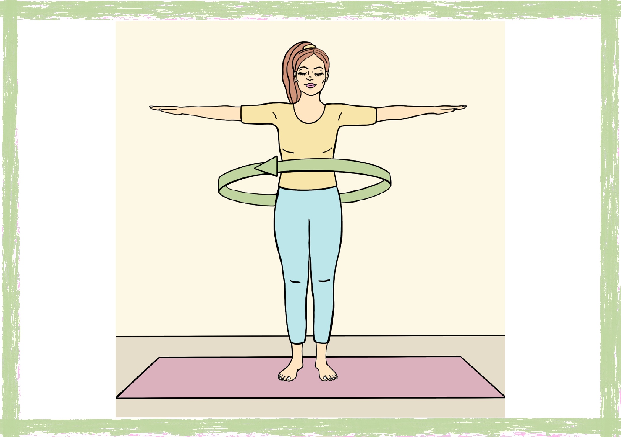 Встаем прямо, поднимаем руки в стороны до уровня плеч и держим их параллельно полу все упражнение. Затем начинаем вращаться по часовой стрелке вокруг своей оси. Для начала это будут 3 оборота за один подход, далее можно наращивать по 3 оборота, и так до выполнения 21 вращения.