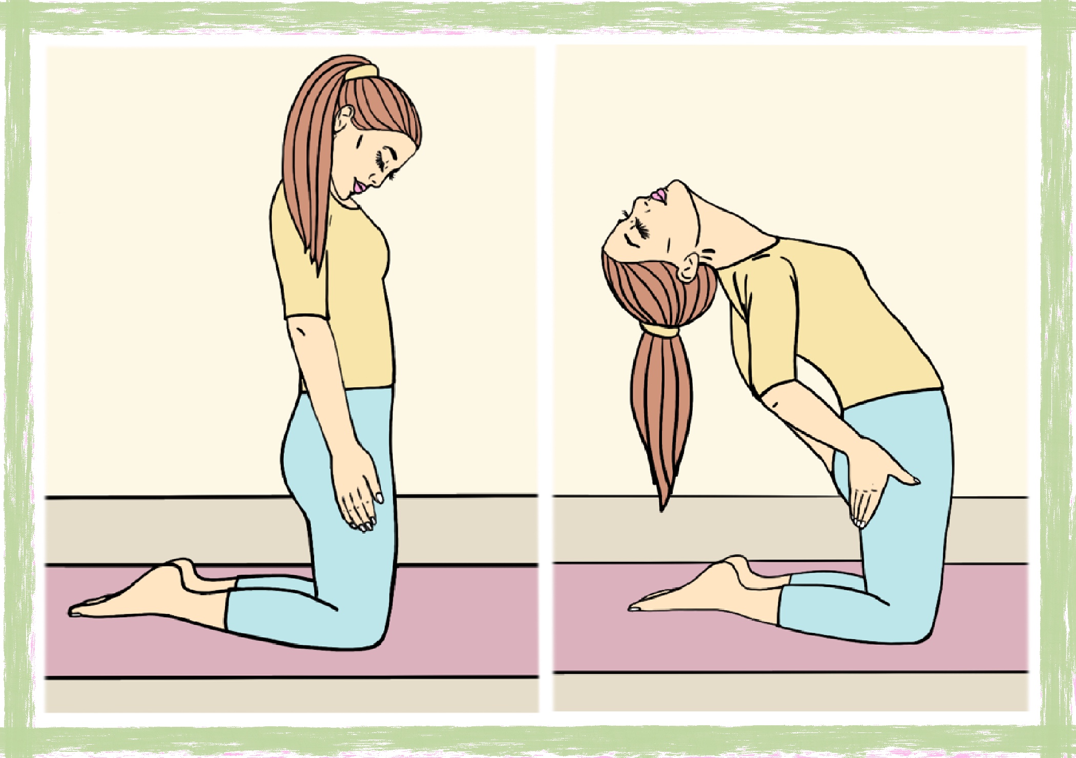 Встаем на колени, которые должны быть на ширине таза. Руки опускаем вдоль тела и ладони кладем на заднюю поверхность бедра. Затем наклоняем голову вперёд, касаясь подбородком груди, и максимально выдыхаем. После с плавным глубоким вдохом откидываем голову назад и делаем прогиб. Грудь максимально выпячиваем, опираясь руками на бёдра, и на плавном глубоком выдохе возвращаемся в исходное положение.