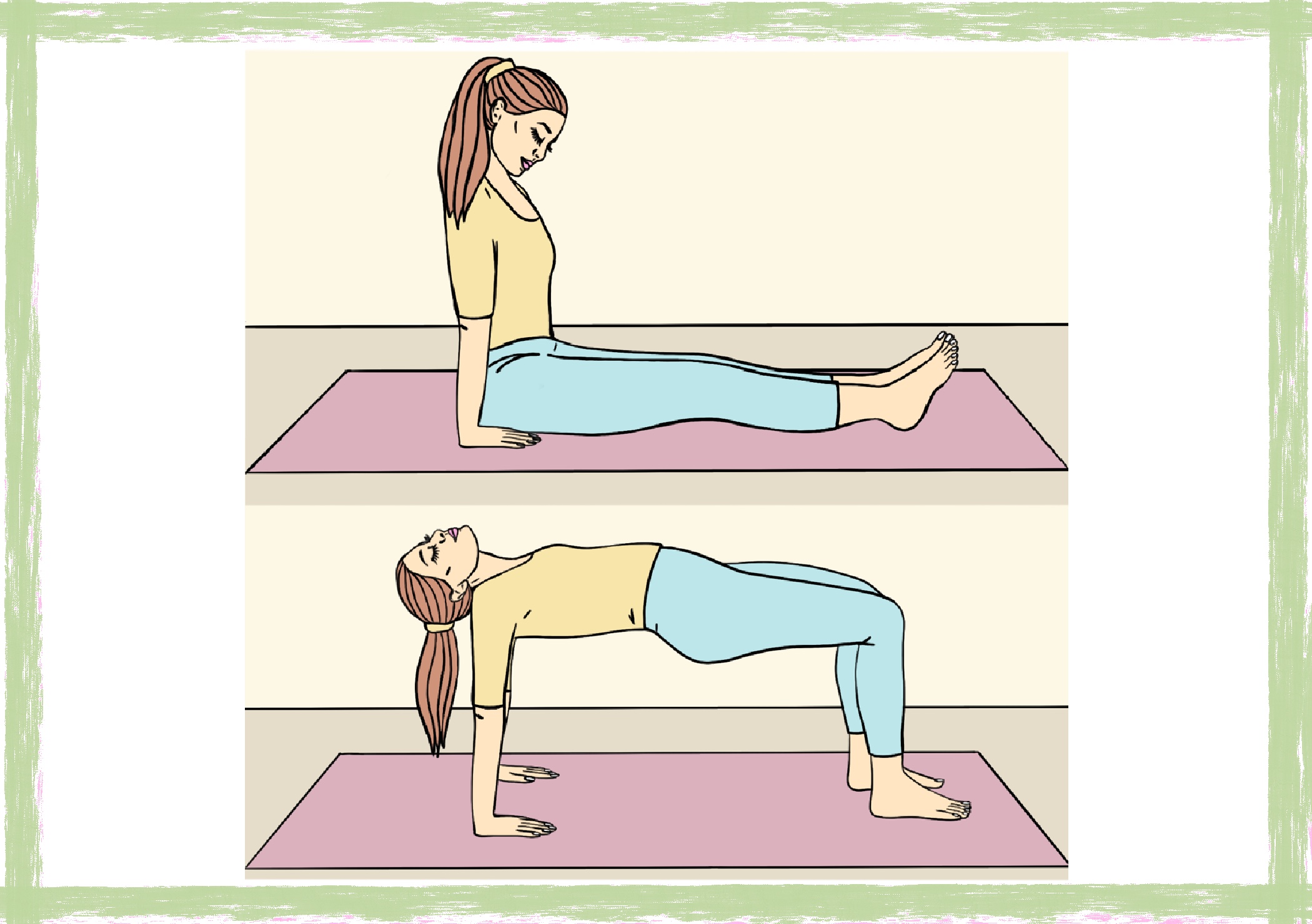 Садимся на пол с прямой спиной и выпрямляем перед собой ноги. Ладони кладем на пол таким образом, чтобы сомкнутые пальцы располагались параллельно телу с направлением вперед. При выдохе наклоняем голову к груди, затем на вдохе запрокидываем ее максимально назад и поднимаем вверх туловище. Должны оказаться в горизонтальном положении, опираясь на прямые руки и ноги под прямым углом. Необходимо на несколько секунд напрячь все мышцы и задержаться в данной позе, а далее на выдохе возвращаемся в положение сидя.