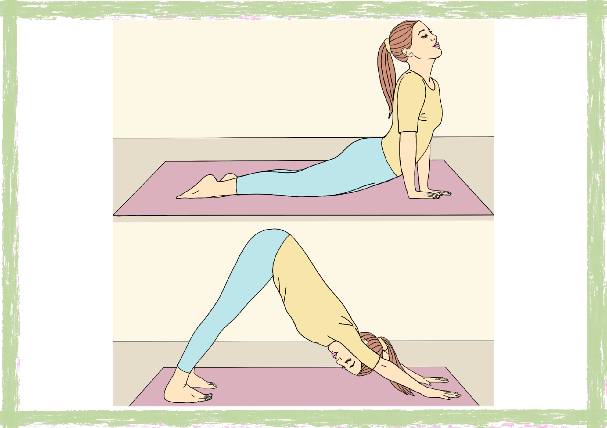 Встаем в упор лёжа на руки и прогибаемся. Ладони и ступни чуть шире плеч, а колени не касаются пола. При выдохе запрокидываем голову. Далее с вдохом поднимаем таз и переходим в позу, образующую угол. Ноги нужно держать прямо. Спина и руки должны находиться на одной прямой. Голову прижимаем к груди. На выдохе возвращаемся в исходное положение.
