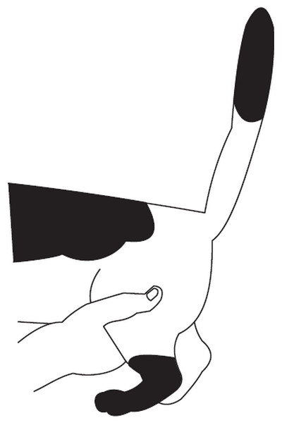 • Если кошка спокойная и не ведет себя агрессивно, то, в случае если вы правша, левой рукой поддерживайте ее туловище под лапы, а правой – грудь и голову. Положение рук должно соответствовать приведенному ниже на рисунке.