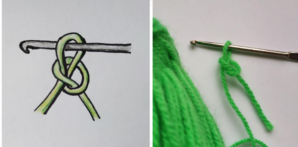 Существует множество способов сделать первую петлю. Рассмотрим два способа. Нить, которая идёт к мотку, я буду называть рабочей нитью.