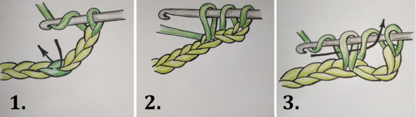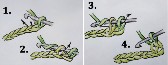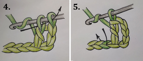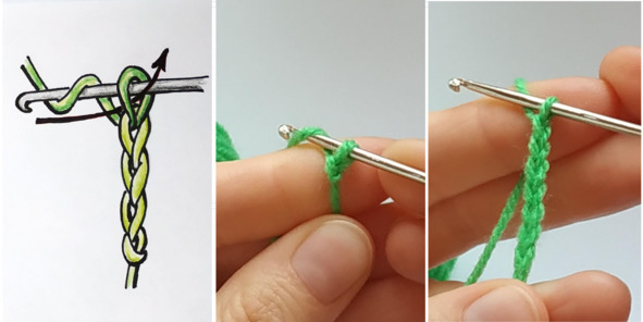 1. Накиньте рабочую нить два раза на крючок как показано на рисунке ниже. Проденьте крючок в петлю предыдущего ряда.