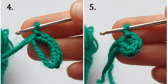 3. Связать 1 столбик без накида, при этом крючок вводить в большую петлю (так называемое кольцо), которая ранее была на указательном пальце.
