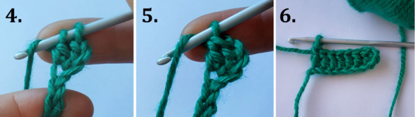 2. Захватите рабочую нить и протяните ее через петлю предыдущего ряда. На крючке у вас должно получиться 4 петли.