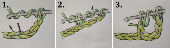 1. Накиньте рабочую нить на крючок как показано на рисунке ниже. Проденьте крючок в петлю предыдущего ряда.