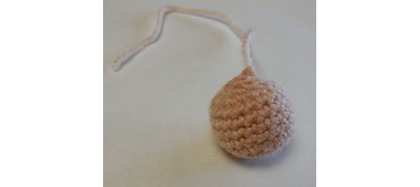 Шить иголкой вперед, захватывая петли колобка и «пальчика», прошить по всей окружности. Удобно пришивать, одев «пальчик» на палец. Лучше сделать два шва по окружности. Сделать закрепительный стежок, иголку выколоть посередине колобка и, слегка натянув, обрезать. Кончик нити спрячется внутри колобочка.