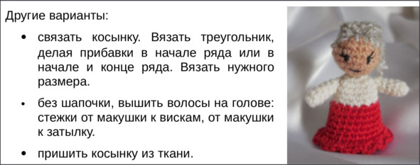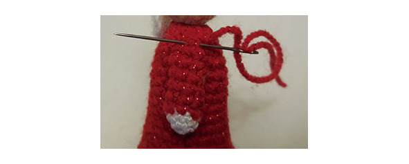 6. Одеть шапочку на голову, пришить шапку к голове кончиком нити от вязания шапки: