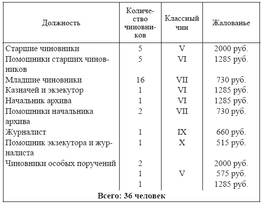 Для заведования делопроизводством в экспедициях были назначены экспедиторы с окладом по 2000 рублей в год, а также старшие и младшие их помощники с окладом содержания: первым по 1500 рублей, а последним по 2000 рублей в год. Назначены были также экзекутор с жалованьем по 2000 рублей, казначей с помощником, который одновременно являлся и журналистом. Итого вместе с управляющим -16 человек. Все без исключения сотрудники являлись ранее чиновниками Особенной канцелярии Министерства внутренних дел. Во всеподданнейшем докладе А.Х. Бенкендорф предлагал: «Передача бумаг, в пятнадцать лет накопившихся в МВД, и первоначальное устройство сего отделения потребует на некоторое время усиленных занятий. Впоследствии, когда все дела получат течение постоянное и правильное, долгом будет позаботиться об уменьшении числа чиновников и об увеличении чрез то окладов»[122].