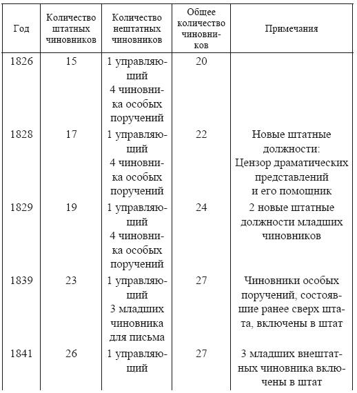 В 1828 г. цензура драматических сочинений была передана из ведения Министерства внутренних дел в III отделение, соответственно увеличилось и число чиновников с 16 до 18 человек за счет цензора и его помощника. В апреле 1829 г. А.Х. Бенкендорф представил Николаю I всеподданнейший доклад о штате своего ведомства, указав, «что с момента учреждения III отделения, оно не получило штата, приличного своему званию и соразмерного с трудами, составляющее оное чиновников. Ходатайство о таковом штате было отложено в намерении: во-первых удостовериться, действительно ли предполагаемая многосложность дел будет соответствовать назначенному числу чиновников и, во-вторых, узнать по опыту меру их деятельности и способностей»[123]. Далее на высочайшее рассмотрение был предложен штат III отделения, который был одобрен и утвержден. Штат предусматривал увеличение количества младших чиновников на 2 человека и незначительное увеличение жалованья. Но все равно, даже по этому штатному расписанию чиновники III отделения получали жалованье меньше, чем в других отделениях Собственной Его Императорского Величества канцелярии, существовало также несоответствие в должностях и чинах.