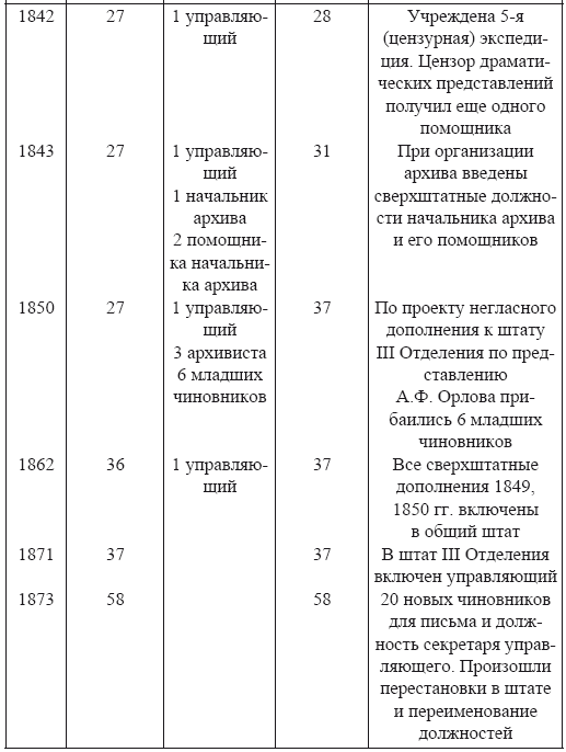 В 1849 г. произошло еще одно изменение в штате. Дело в том, что к 1849 г. окончательно оформился архив III отделения, и на основании всеподданнейшего доклада А.Ф. Орлова были введены сверхштатные должности начальника архива и двух помощников (в штат и в смету по III отделению как постоянные они были включены в 1862 г.).