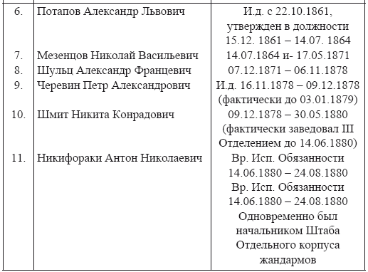 24 марта 1839 года должности начальника Штаба Корпуса жандармов и Управляющего III Отделением были соединены в одном лице. В мае 1871 была учреждена должность товарища Главного начальника III Отделением, должности Управляющего III Отделением и начальника Штаба Отдельного Корпуса жандармов были разъединены.
