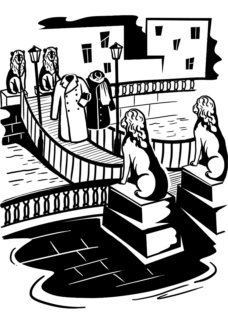 Виделось ей чёрное пальто, под воротником обмотанное шарфом, которое прогуливалось под руку с шинелью туда-сюда по Львиному мостику. Как это получалось, что гардероб передвигался сам по себе, не имея даже ног, ничуть не удивляло Ирэну Дмитриевну. Она наблюдала за происходящим словно бы немного сверху. Белые львы кивали в такт движениям гуляющих, отчего мостик начинал покачиваться. Вдруг откуда-то возникла Алла Леонардов-на, погрозила львам пальцем, пискнула: «Не сметь ходить по выставке!» – а потом сардонически захохотала голосом Николая. Ирэна Дмитриевна решила, что в данном вопросе она солидарна с Аллой Леонардовной. А потом всё заволокло бледно-голубым туманом, и наступило утро. Сон Ирэне Дмитриевне не запомнился, но оставил непонятное щемящее чувство потери чего-то, может быть и незначительного, но милого сердцу.