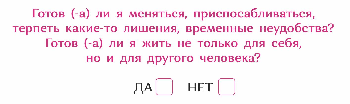 Первое, что необходимо сделать желающим вступить в супружеский союз, – определить, хочешь ли ты именно того, к чему сейчас стремишься? Для чего тебе семья? Прежде всего, нужно точно знать свои желания, стремления и цели. Поэтому честно и прямо ответьте себе на следующие вопросы.