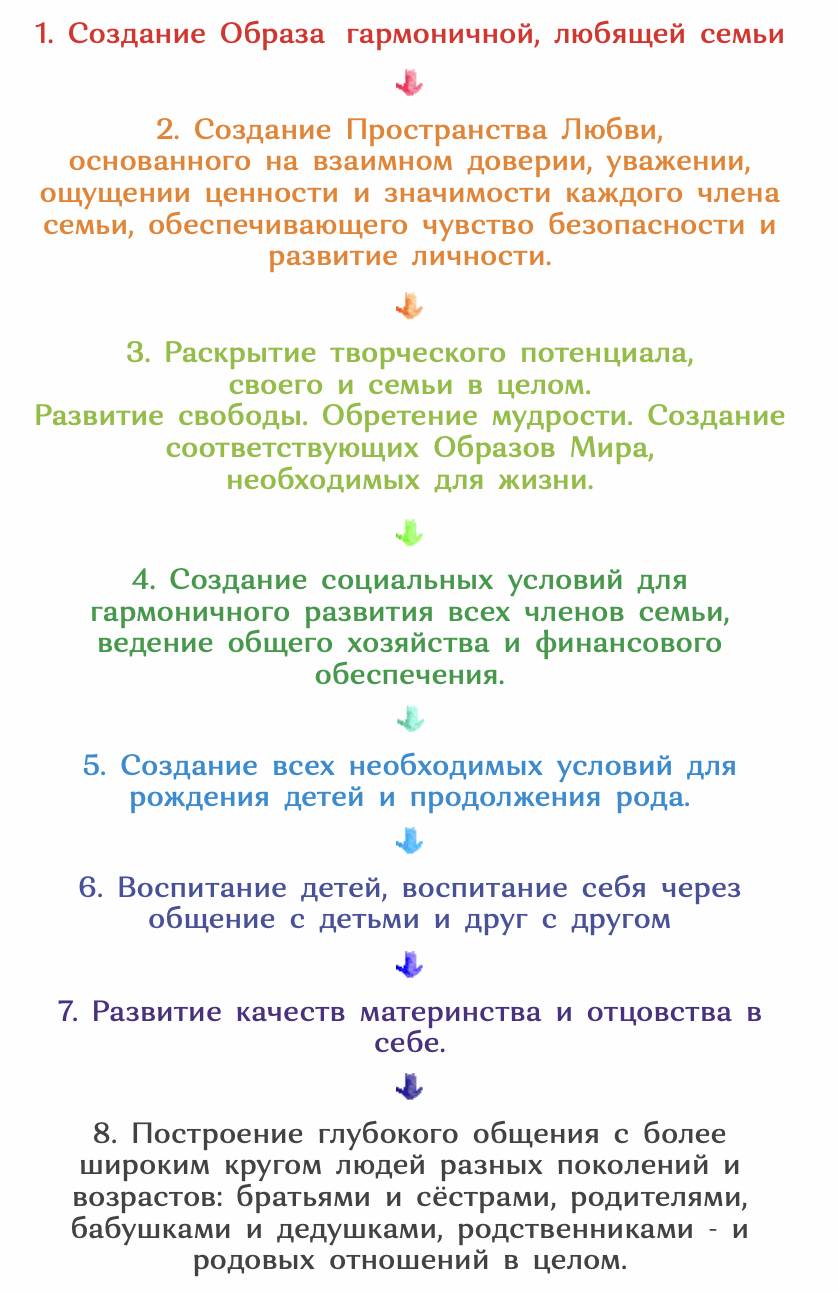 Задачи – это не то, что вы обязаны сделать или реализовать в семье. Это не какое‑то бремя, которое ложится на плечи семьи. Это радостные творения, реализовав которые шаг за шагом, вы сможете с гордостью оглянуться назад и удовлетворённо сказать: «Мы всё сделали для своего прекрасного Рода!» Конечно, каждая семья ставит свои задачи, но это тот главный каркас, на который вы можете нанизывать всё, что пожелаете.