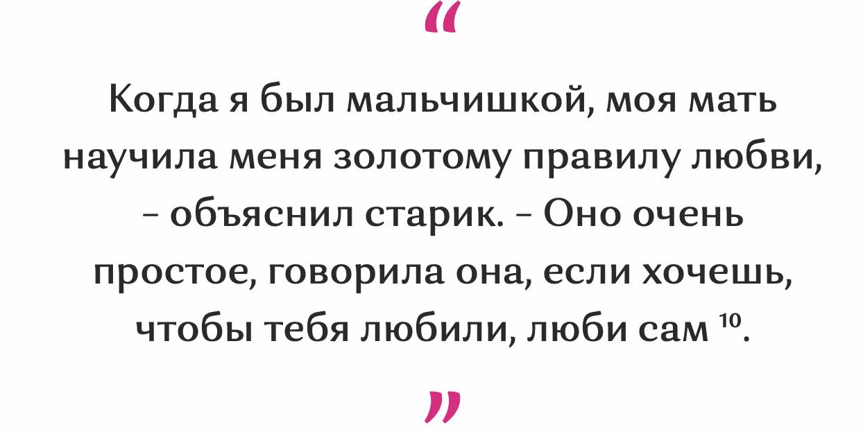 – Поверьте мне, – сказал старик, – когда вы достигнете конца вашей жизни, единственное, что будет иметь какое‑то значение, – это та любовь, которую вы отдали и получили. В своём путешествии в следующий мир единственное, что вы можете взять с собой, – это любовь. Единственная ценная вещь, которую вы оставите в этом мире, – это любовь. Больше ничего. Я знал людей, которые легко переносили много трудностей в своей жизни и были счастливы, но ещё не встречал человека, который мог бы перенести жизнь без любви.