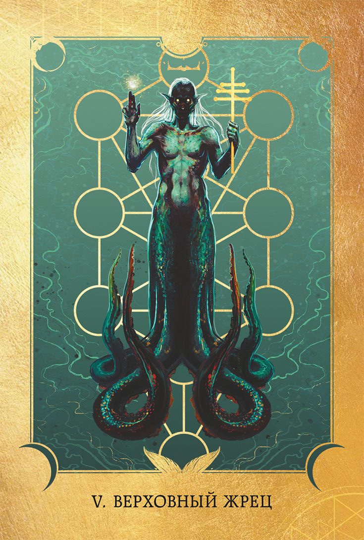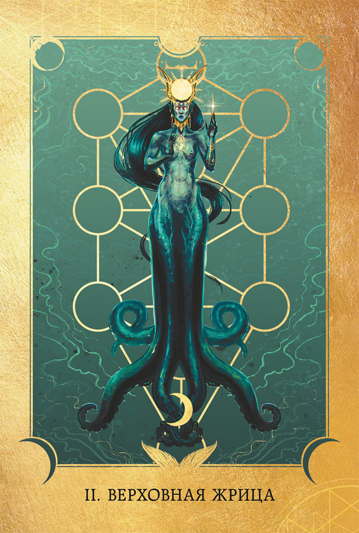Морская ведьма предстает в виде рогатой богини-праматери. Между ее рогов сияющий диск, ночное светило, которое обладает солнечными и лунными свойствами одновременно. Но Солнце ночью скрыто в стране мертвых, оно озаряет то, что скрыто под землей. Жрица опирается на скрытые знания, те, что хранятся в темных лабиринтах разума. Интуитивные озарения – это послания из подсознания, им стоит доверять.