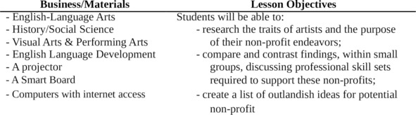 What social issues motivate students within their community? The purpose of this lesson is for Individual students to develop a Project where they design a nonprofit business plan using their art major to facilitate their organization’s mission.