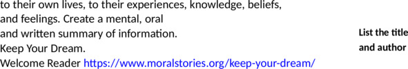 https://www.moralstories.org/keep-your-dream/Keep Your Dream.Welcome Reader– A projector– A Smart Board– Computers with internet accessLesson Objectives– Students will be able to define vocabulary words, identify the main characters, describe the scenes and setting.